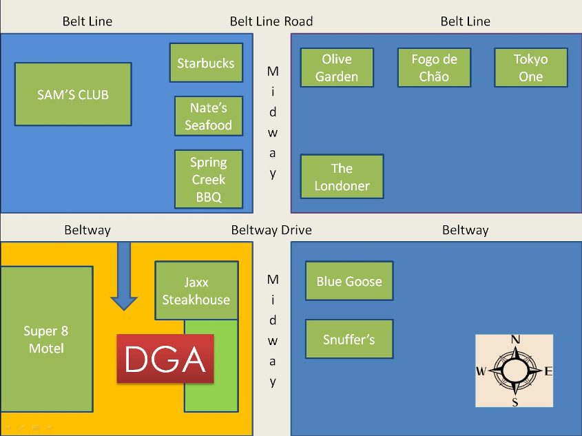 We are on the southwest corner of Midway and Beltway, one block south of Belt Line Road.